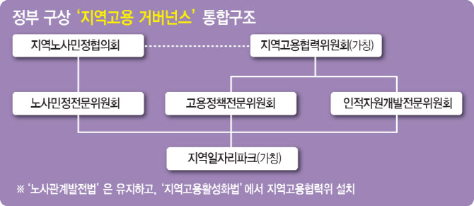 구체적으로 정부는 광역지자체별로 ‘지역고용협력위원회’(가칭)를 두고 산하에 ‘고용정책전문위원회’와 ‘인적자원개발위원회’를 설치하는 안을 들여다보고 있다. 지역 일자리 사업은 고용정책전문위가 심의해 지역고용협력위가 최종 의결하는 구조다. 그리고 지역일자리파크에 상설 사무국을 둬 고용정책전문위와 지역고용협력위에서 심의·의결한 정책을 집행하도록 하겠다는 게 정부 구상이다.