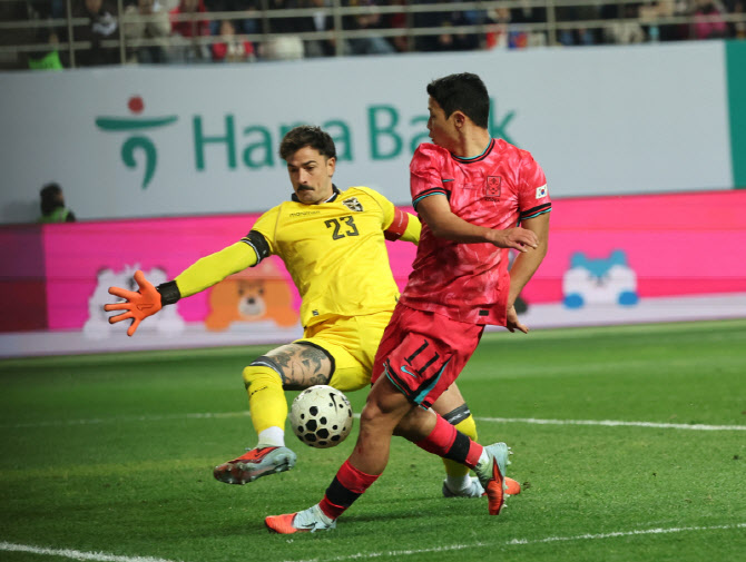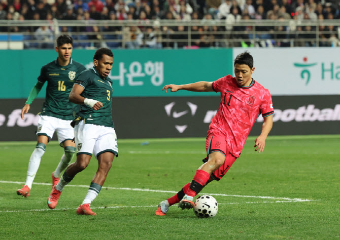 | | 14일 대전월드컵경기장에서 열린 남자축구 국가대표 A매치 평가전 대한민국과 볼리비아의 경기. 한국 황희찬이 골문 앞 슛을 시도하고 있다. 사진=연합뉴스 |