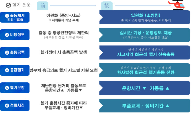 이를 통해 기존의 ‘관할’대신 ‘최인접·최적정 헬기 투입’ 원칙으로 전환되면서 출동 공백 해소, 비행 안전 강화, 전국 단위 자원의 효율적 배분을 가능하게 할 것으로 기대하고 있다.