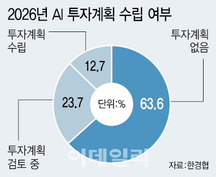 7일 한국경제인협회가 여론조사기관 모노리서치에 의뢰해 매출액 500대 기업을 대상으로 진행한 설문에 따르면 AI 투자 계획이 없는 기업은 63.6%를 차지했다. 사실상 절반 넘는 기업들이 내년 AI 투자 계획을 세우지 않은 셈이다. AI 투자계획을 검토 중인 기업은 23.7%, AI 투자계획을 수립한 기업은 12.7%에 불과했다.