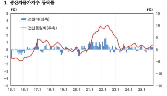 공산품은 석탄및석유제품이 5.0%, 컴퓨터·전자및광학기기가 2.3% 상승하면서 전체 0.8% 올라 생산자물가를 끌어올렸다. 석탄및석유제품의 상승폭은 지난 2023년 9월 6%대 상승 이후 최대폭 오름세다.