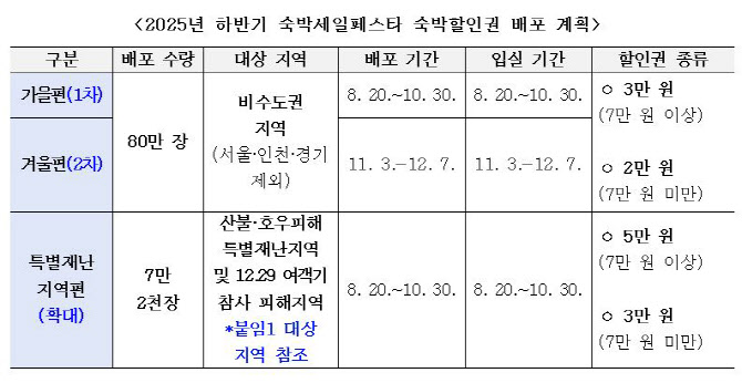 문체부에 따르면 이번 행사는 제2차 추가경정예산(147억 원)으로 편성된 50만 장을 포함한 숙박할인권 총 80만 장(236억 원)을 발급한다. 이와는 별도로 산불·호우로 피해를 본 특별재난지역과 12.29 여객기 참사 피해지역을 대상으로 숙박할인권 총 7만 2000장을 추가로 지원해 지역 경제 회복과 관광 활성화를 도모하기로 했다.