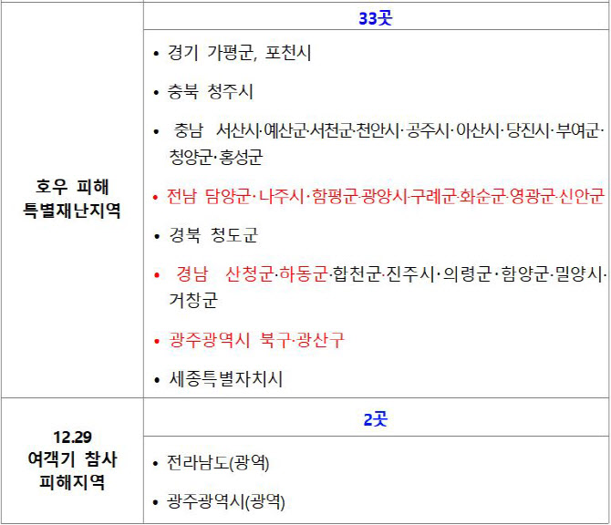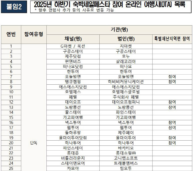 특별재난지역편은 산청·하동·안동·영덕·영양·의성·청송·울주 등 산불 피해지역으로 지정된 특별재난지역을 비롯해 12.29 여객기 참사 피해지역 전남과 광주광역시뿐 아니라, 호우 피해지역인 경기, 충북, 충남, 전남, 경북, 경남, 광주, 세종 등 8개 광역지자체 내 33개 시·군·구도 포함해 지원한다. 특별재난지역편 대상 지역은 할인 혜택도 확대한다. 숙박상품이 7만 원 이상일 경우 5만 원, 7만 원 미만일 경우 3만 원의 할인을 받는다.