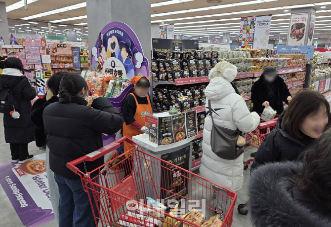 | | 캐리어를 끌고 방문한 외국인 관광객이 다수 포착된 서울역점 매장 내부. K푸드 상품을 중심으로 기획된 전용 진열대 주변이 붐비고 있다. (사진=롯데마트) |