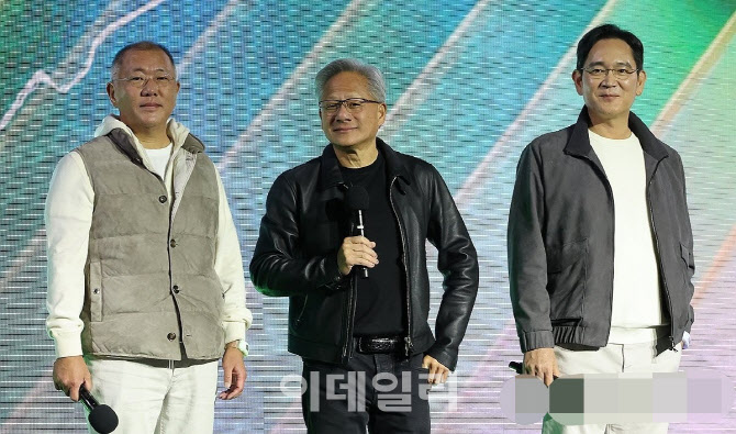 | | 젠슨 황 엔비디아 최고경영자와 이재용 삼성전자 회장, 정의선 현대차그룹 회장이 30일 서울 코엑스에서 열린 엔비디아의 그래픽카드(GPU) ‘지포스’ 출시 25주년 행사에서 단상에 올라 인사를 하고 있다. (사진=연합뉴스) |