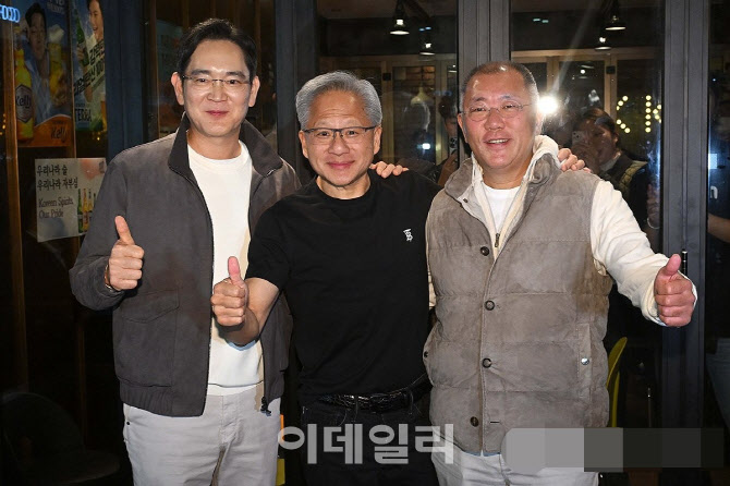 | | 젠슨 황 엔비디아 최고경영자가 30일 서울 삼성동 한 치킨집에서 진행된 이재용 삼성전자 회장, 정의선 현대차그룹 회장과 회동을 마친 후 기념촬영을 하고 있다. (사진=연합뉴스) |