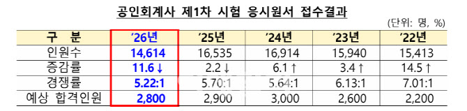 최근 5년간 CPA 시험 지원자 수는 2022년 1만5413명, 2023년 1만5940명, 2024년 1만6914명, 2025년 1만6535명을 기록했다. 올해는 2년 연속 감소세를 보이며 2022년 수준으로 돌아갔다.